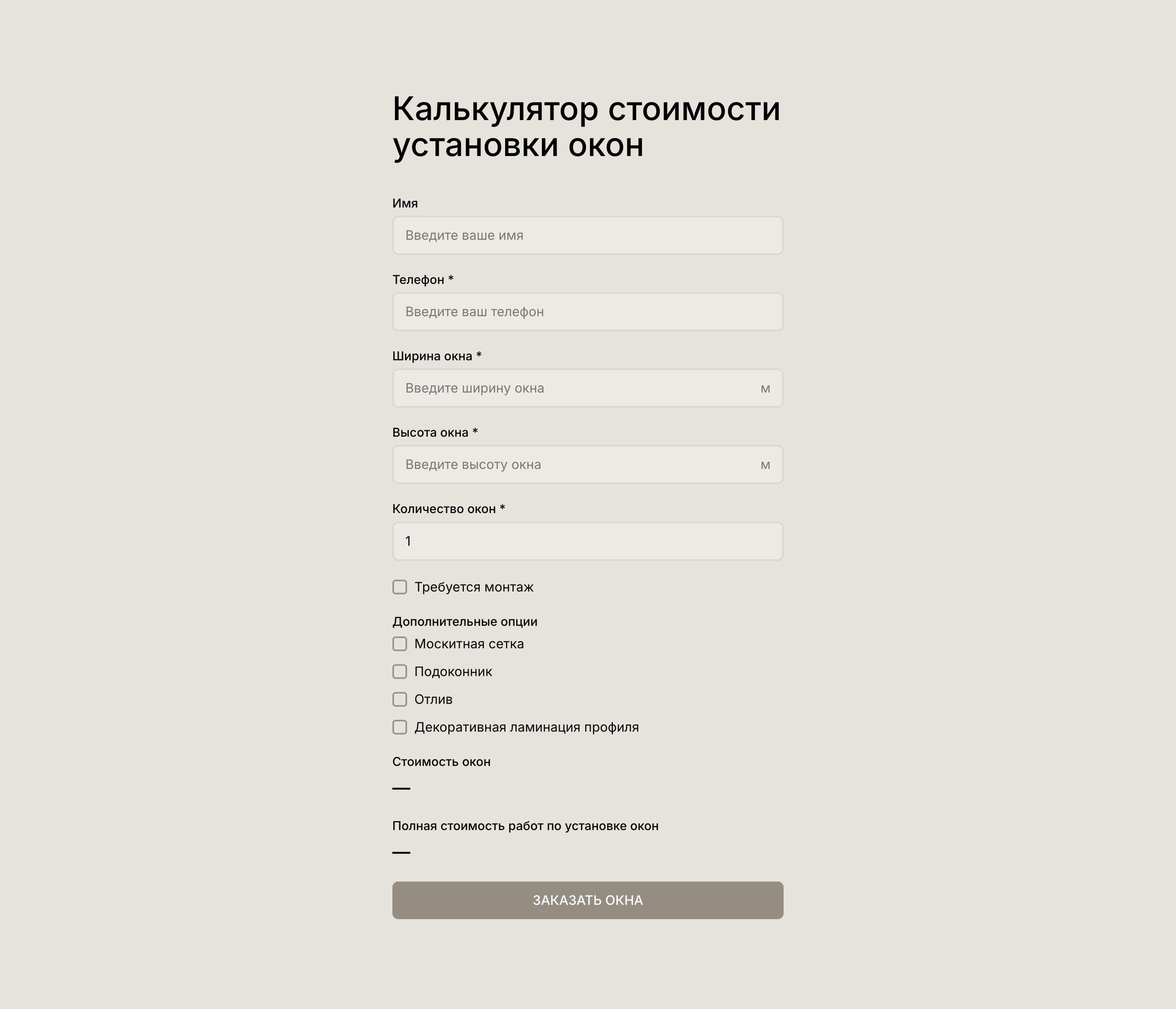 В этом примере ваш клиент рассчитывает стоимость окна с учетом дополнительных опций и монтажа.